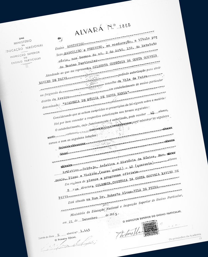 Em Dezembro de 1955, com o alvará concedido pelo Ministério da Educação Nacional, Gilberta Custódia da Costa Gouveia Xavier de Paiva fundou a Academia de Música de Santa Maria, em Vila da Feira, assumindo a sua Direção.
